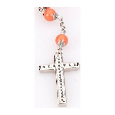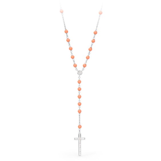 COLLANA ROSARIO BROSWAY. LUNGHEZZA 70CM IN ACCIAIO CON PERLINE ARANCIONI E CROCE PENDENTE.