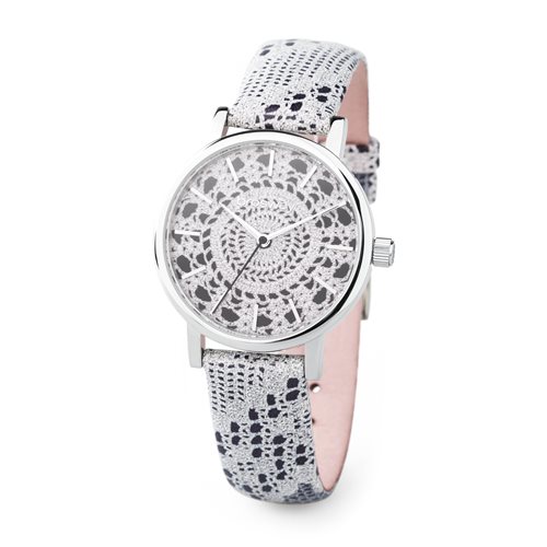Funzioni: ore, minuti, secondi Movimento: solo tempo GL 30 Cassa: acciaio 316L e vetro minerale Quadrante: stampa motivo pizzo Impermeabilità: 3 atmosfere Cinturino: in cuoio stampa motivo pizzo.