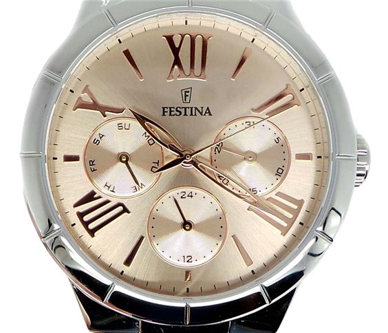 FUNZIONI: multifunzione calendario donna MOVIMENTO: MYOTA JAPAN CARATTERISTICHE: cassa e bracciale in acciaio, apertura a pulsante, vetro minerale, datario nei tre circolari sul quadrante color rosa metallizzato, fondello chiuso a pressione WR 3atm. DIMENSIONI: diametro cassa 37mm. PREZZO/QUALITA' il segno distintivo del marchio FESTINA.L'immagine è indicativa , la confezione può variare di forma e colore. Immagine indicativa , la confezione può variare in forma e colore.