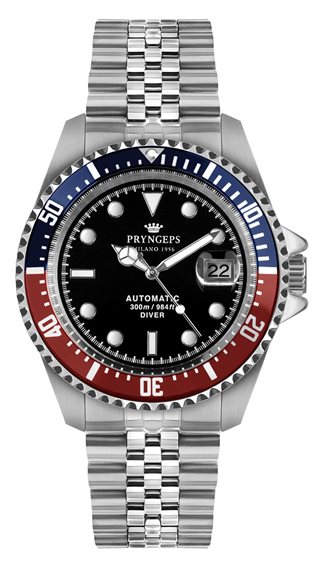 Acciaio diametro 44 mm, water resistant 30 ATM, corona serrata a vite, vetro minerale con lentino datario, fondello acciaio serrato a vite, ghiera girevole unidirezionale 120 scatti, spessore della cassa mm 11,00. Nero ghiera blu/rossa o nero ghiera nero/blu, datario al 3. BRACCIALE Acciaio solido, chiusura deployante personalizzata MOVIMENTO Automatic, Automatico SEIKO NH-35